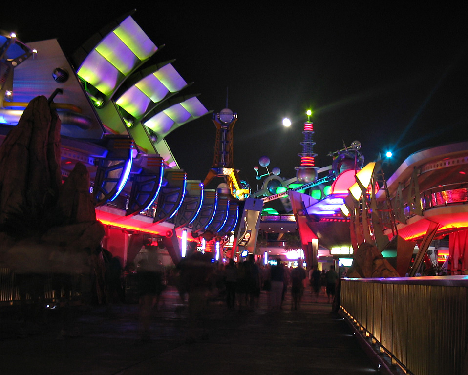 Tomorrowland (Magic Kingdom) at night.Filename: Tomorrowland.jpgExposure: at f/2.52003:08:15 22:25:09Canon Canon PowerShot G3